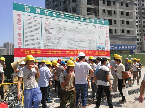 同時為進(jìn)一步推進(jìn)保障房項目文明施工管理,7月26日上午,公司黨委、工會、安委會再次對丈八路保障房項目開展“送清涼·享關(guān)愛”防暑降溫慰問活動。將西瓜、綠豆、白糖等防暑降溫用品送達(dá)施工一線的工人手中,并叮囑大家一定要嚴(yán)格執(zhí)行高溫措施,注意勞逸結(jié)合和防暑降溫,切勿麻痹大意造成傷害。長期身處一線職工對公司黨委、工會和安委會的關(guān)愛行動表示感謝。