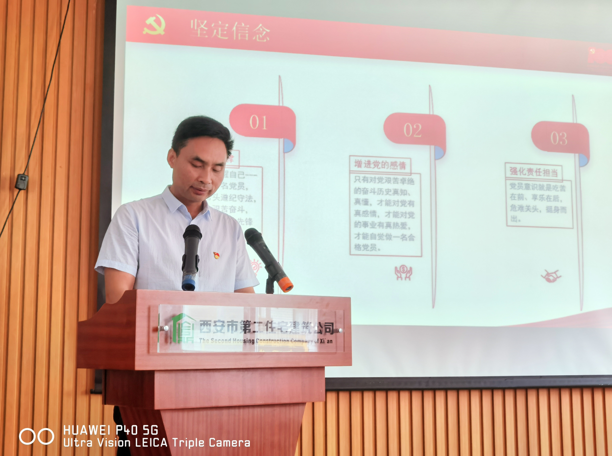 黨委書記吳高祥同志在黨課中要求,一要緬懷光榮歷史,汲取砥礪前行的強(qiáng)大精神力量。各基層黨組織要開展好黨史學(xué)習(xí)教育,切實做到學(xué)史明理、學(xué)史增信、學(xué)史崇德、學(xué)史力行,不斷增強(qiáng)使命意識和責(zé)任擔(dān)當(dāng),不斷在各項工作中走在前列、做出表率、勇爭第一。二要強(qiáng)化黨員教育,提升基層黨組織的凝聚力、戰(zhàn)斗力。要不斷強(qiáng)化黨員的身份、責(zé)任、服務(wù)、政治“四種意識”,落實基層黨建工作責(zé)任制,創(chuàng)新黨建工作思路,不斷提升黨員的政治素養(yǎng),發(fā)揮好基層黨組織的戰(zhàn)斗堡壘作用。三要敢于擔(dān)當(dāng)作為,譜寫住宅二建發(fā)展的嶄新篇章。要深刻把握“學(xué)史力行,實干為民”的核心要求,持續(xù)改進(jìn)工作作風(fēng),以更高的標(biāo)準(zhǔn)、更嚴(yán)的要求、更實的舉措做好城市精細(xì)化管理工作。