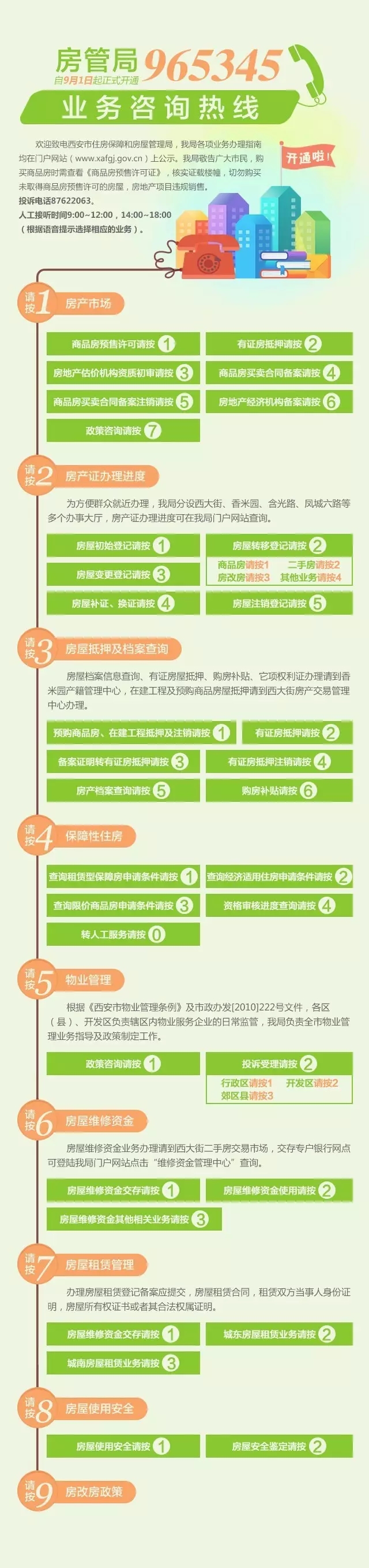 熱線的受理范圍包括:房產(chǎn)市場、房產(chǎn)證辦理、房產(chǎn)抵押及檔案查詢、保障性住房、物業(yè)管理、房屋維修資金、房租租賃管理、房屋使用安全、房改房政策九大類問題。