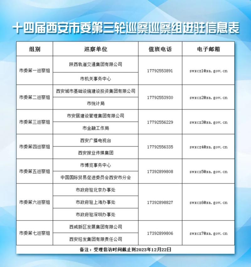 經(jīng)市委批準(zhǔn),十四屆市委第三輪巡察共成立7個(gè)巡察組,分別對(duì)陜西軌道交通集團(tuán)有限公司、市統(tǒng)計(jì)局、市金融工作局、市機(jī)關(guān)事務(wù)中心、市博覽事務(wù)中心、西安報(bào)業(yè)傳媒集團(tuán)、西安廣播電視臺(tái)、中國(guó)國(guó)際貿(mào)易促進(jìn)委員會(huì)西安市分會(huì)、西安城市基礎(chǔ)設(shè)施建設(shè)投資集團(tuán)有限公司、市安居建設(shè)管理集團(tuán)有限公司、市政府駐北京辦事處、市政府駐上海辦事處、市政府駐深圳辦事處等13家單位開(kāi)展常規(guī)巡察,對(duì)西咸新區(qū)發(fā)展集團(tuán)有限公司、西安經(jīng)發(fā)集團(tuán)有限責(zé)任公司2家單位開(kāi)展提級(jí)巡察。